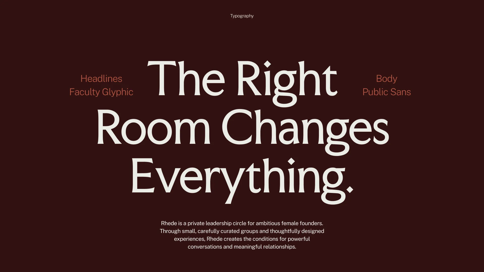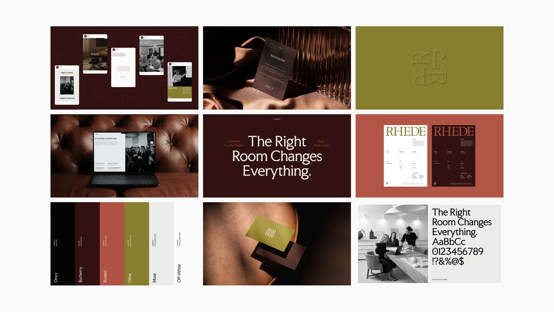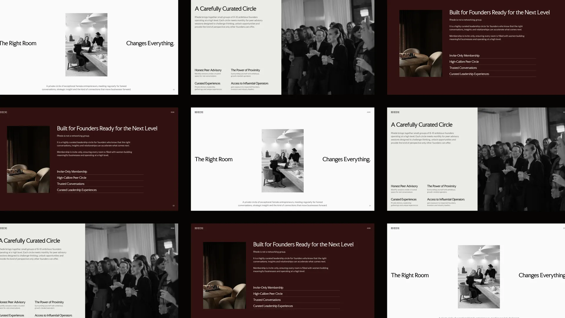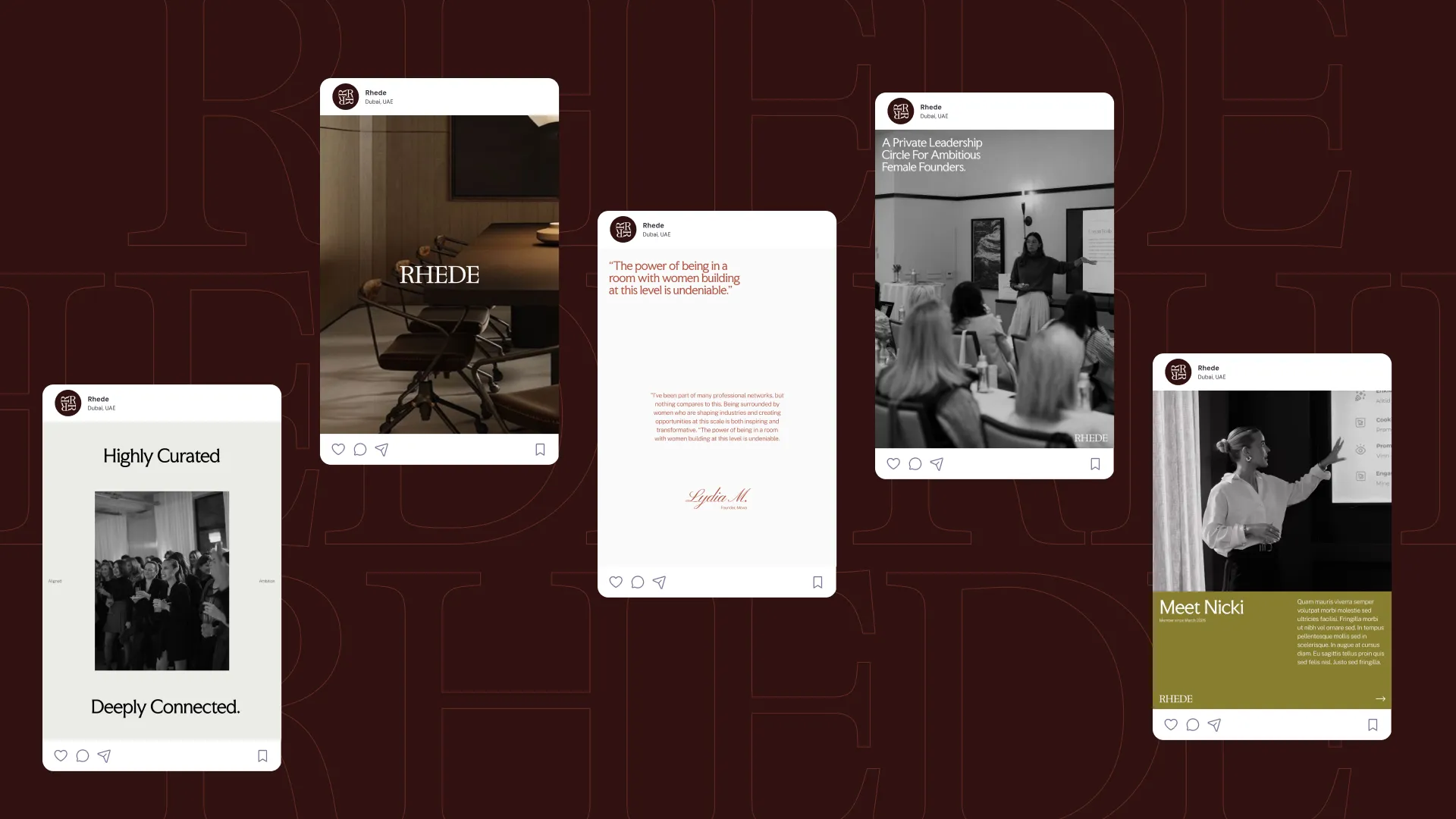 Through a focused brand sprint, we focused first on positioning Rhede as a space for women who are already in motion, not starting out, but building with clarity and intent. The strategy centred on removing the expected. Avoiding overly soft, overly polished, or performative “empowerment” aesthetics, and instead building something that felt grounded, refined, and quietly confident. Visually, the identity leans into restraint. A deeper, more considered colour palette creates a sense of focus and presence, while typography brings structure and clarity without feeling rigid. Every element was designed to feel intentional, from spacing and layout to the way the brand holds itself across touchpoints. The result is a system that doesn’t rely on being loud, but instead builds recognition through consistency, clarity, and subtle distinction.