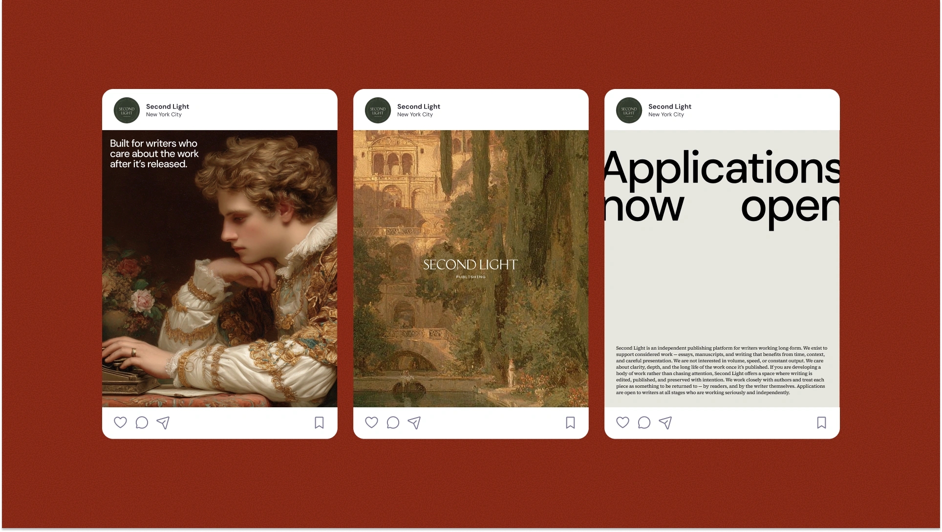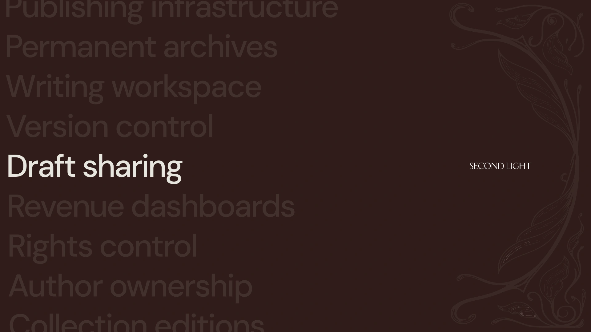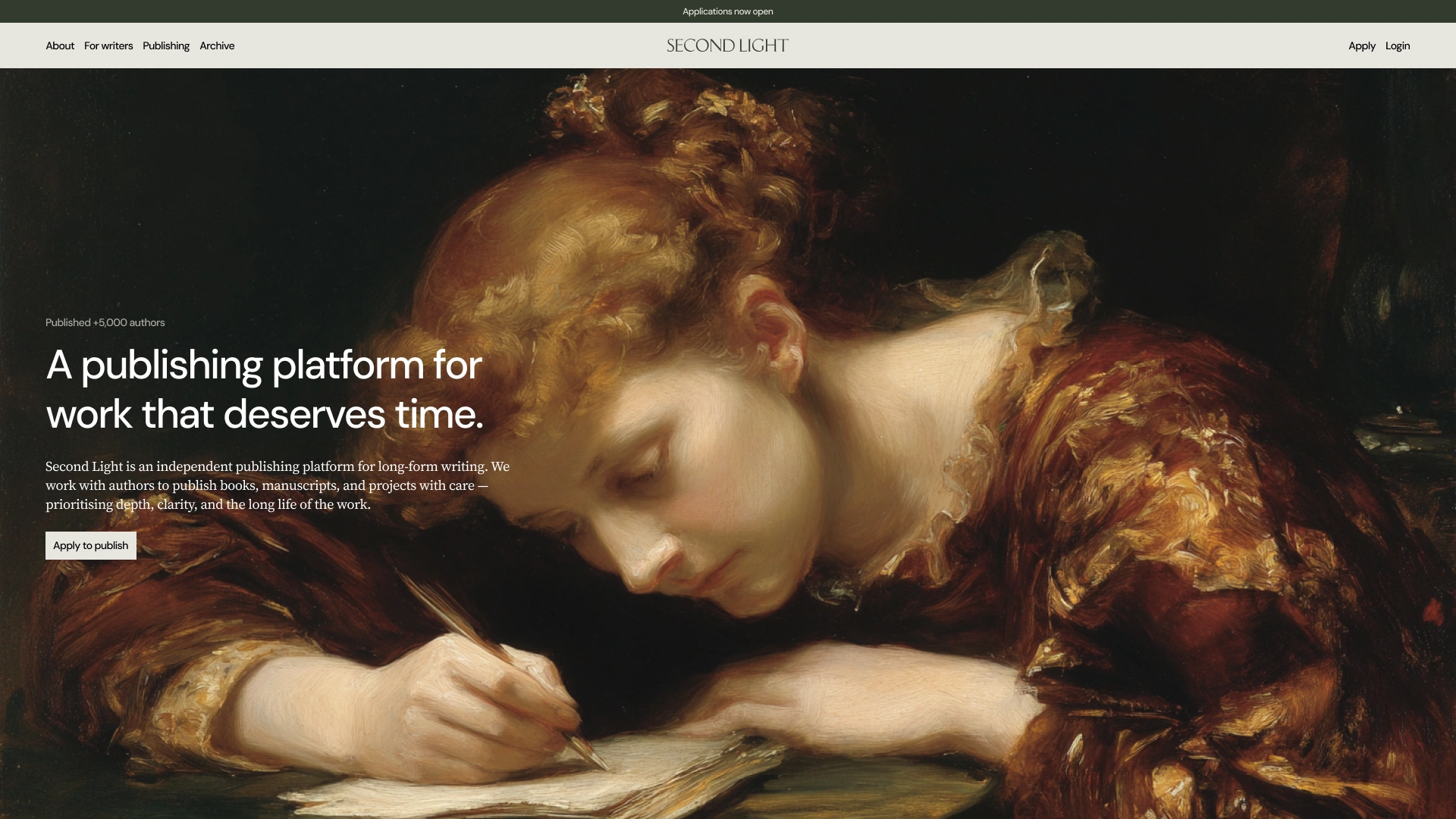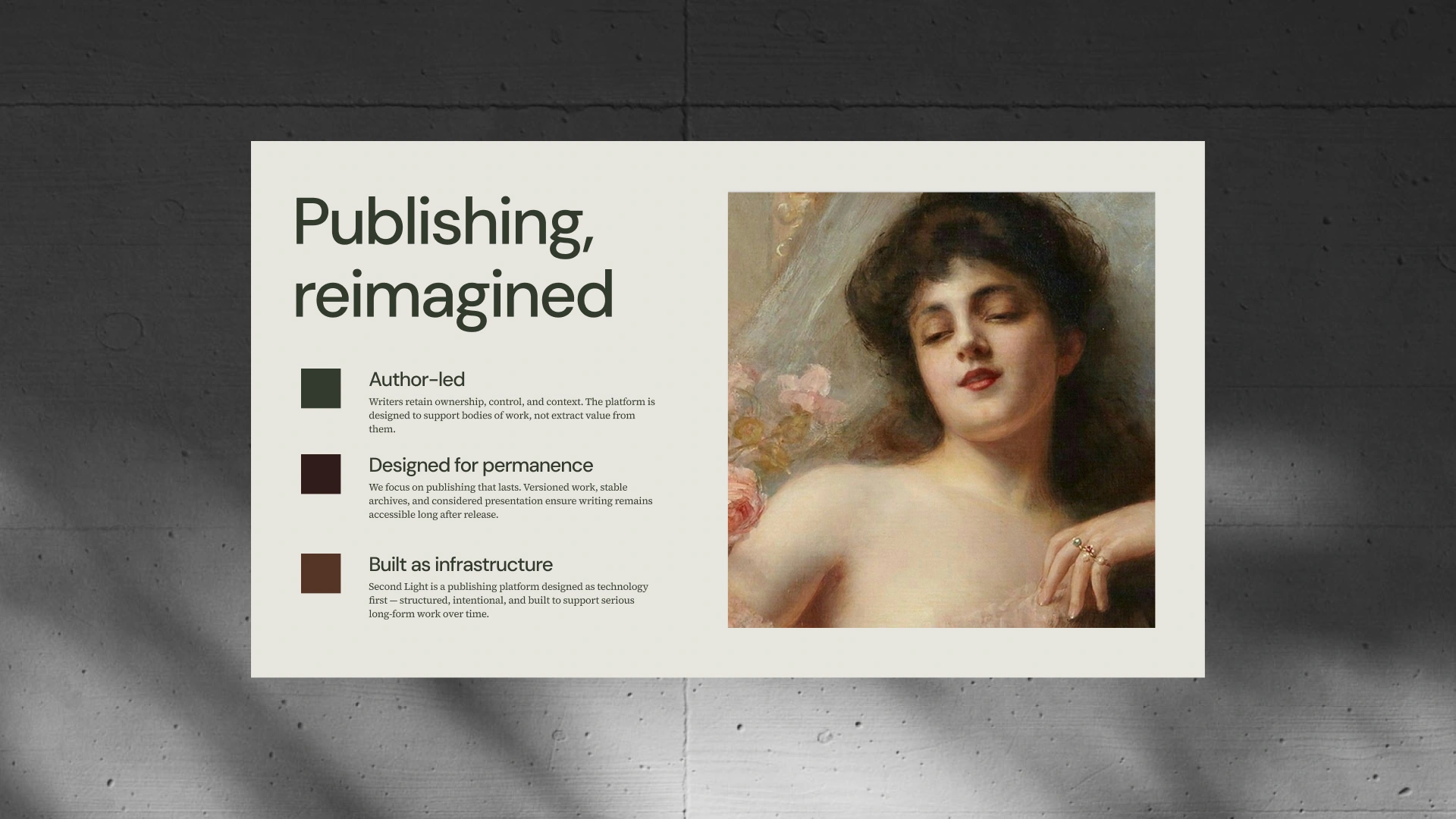 Second Light is a technology platform built to support long-form writing and serious publishing in a digital landscape dominated by speed, feeds, and short-form content. Designed for authors working on enduring ideas, the platform provides structured infrastructure for publishing, archiving, and presenting written work over time. Operating at the intersection of technology, publishing, and culture, Second Light needed a brand that could communicate credibility, permanence, and technical rigour, without feeling academic or inaccessible.